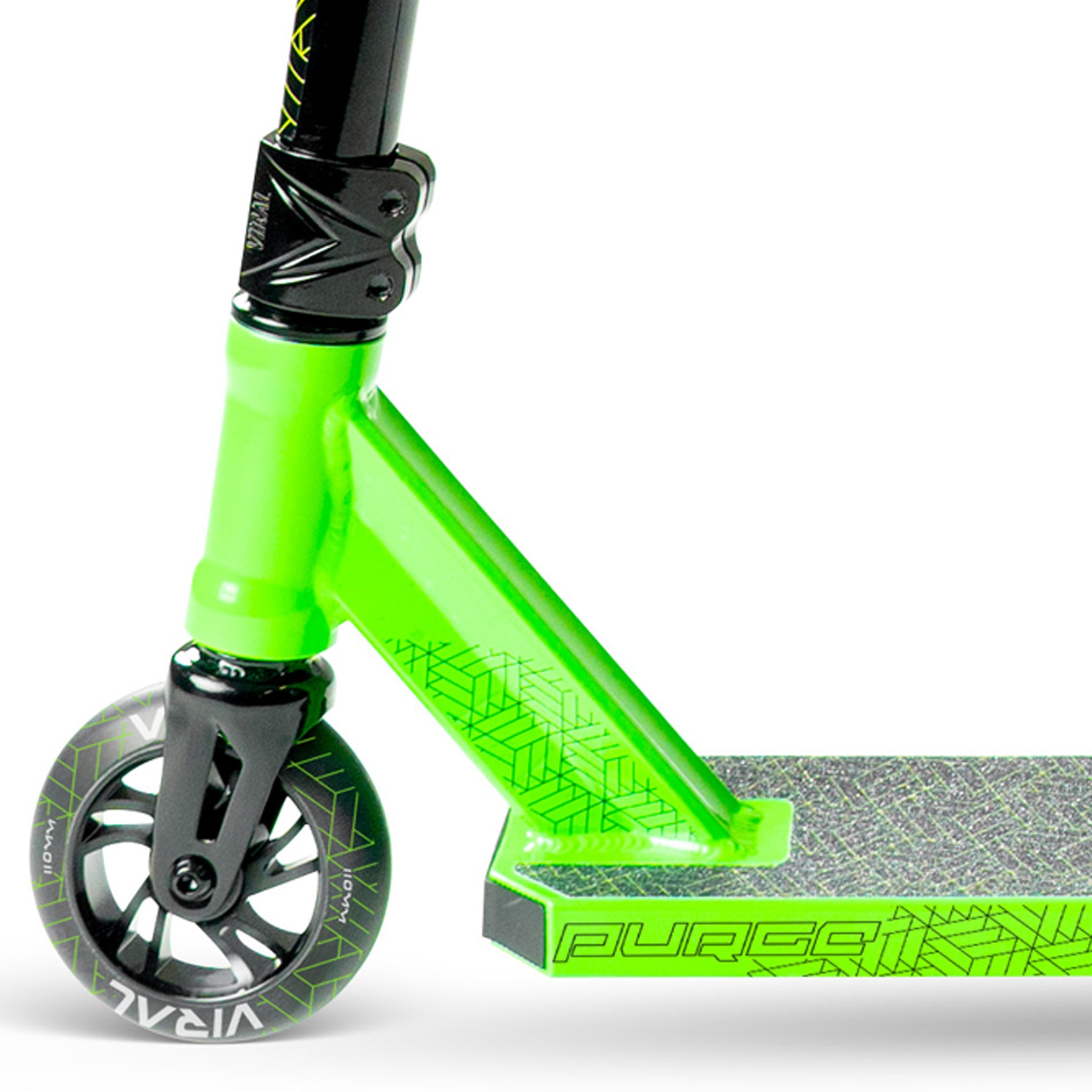 Mit seinem kompakten, 4,5 Zoll breiten Aluminiumdeck, 110-mm-Aluminiumkernrollen und einem 24 x 22 Zoll großen Low-Rise-T-Lenker bietet der VIRAL PURGE PRO eine ausgewogene Geometrie für Street- und Park-Riding. Die Hochgeschwindigkeits-ABEC-11-Lager sorgen für ein sanftes Fahrgefühl, während der integrierte Steuersatz und die IHC-Stahlgabel die nötige Reaktionsfähigkeit für Grinds, Whips und Manuals bieten.